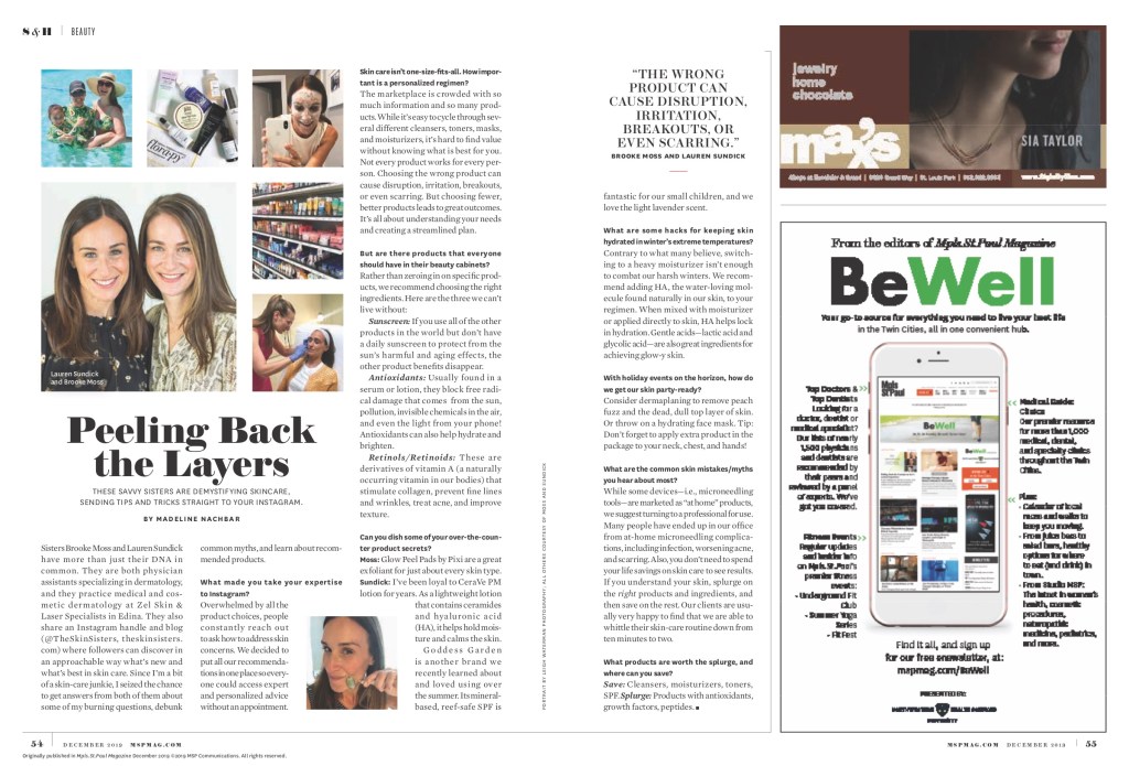 In case you missed it! The Skin Sisters were featured in the December issue of Mpls.St Paul Magazine. We shared our best tips, tricks & skincare secrets with style editor Madeline Nachbar. We talked about personalizing your skincare regimen and using products that really work for you – and not too many of them!